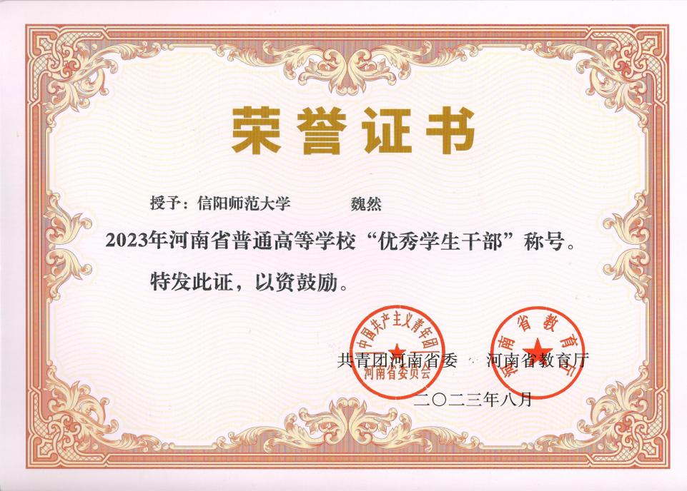 近日,共青团河南省委、河南省教育厅下发了《关于发布2023年河南省普通高等学校三好学生、优秀学生干部和先进班集体名单的通知》(豫青联字〔2023〕28号),万象城官网研究生学生干部魏然荣获河南省“优秀学生干部”荣誉称号。