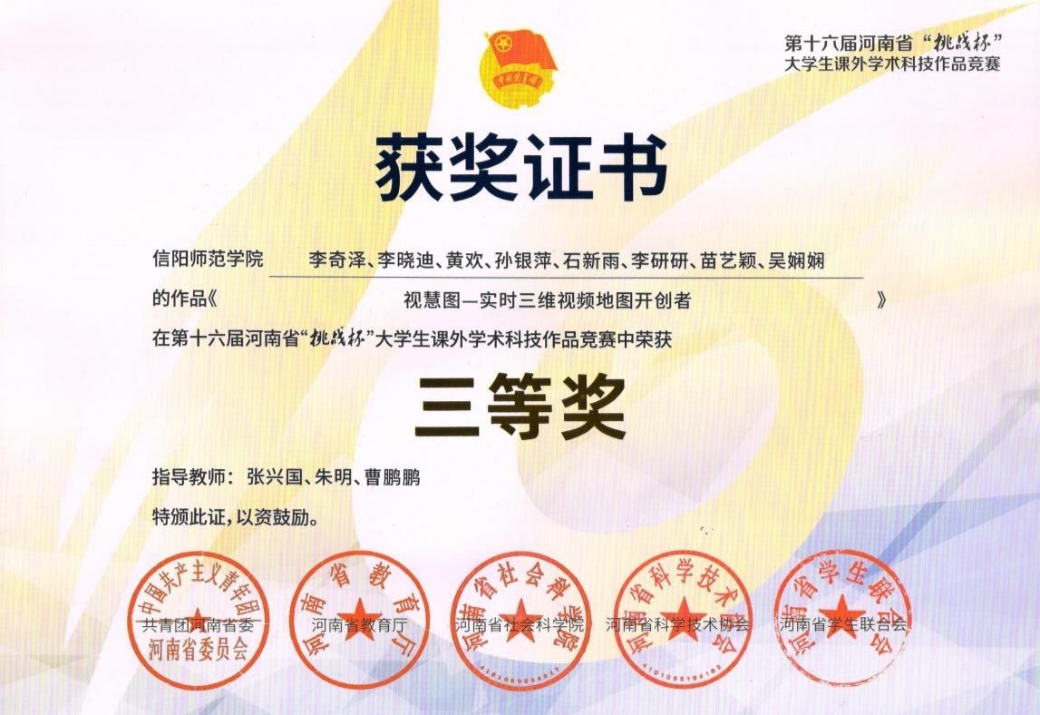 近日,共青团河南省委公布了河南省第十六届“挑战杯”大学生课外学术科技作品竞赛的获奖名单,万象城官网张兴国副教授、朱明博士和曹鹏鹏老师指导,2021级地图学与地理信息系统专业研究生李奇泽等人完成的《视慧图—实时三维视频地图开创者》,从众多作品中脱颖而出,荣获第十六届河南省“挑战杯”大学生课外学术科技作品竞赛三等奖。