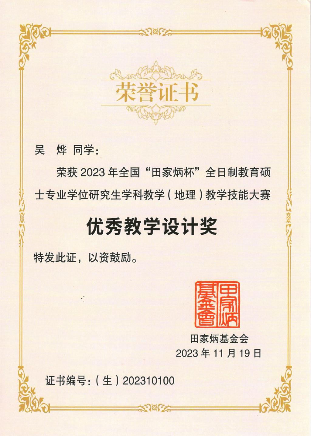 11月17—19日,2023年全国“田家炳杯”全日制教育硕士专业学位研究生学科教学(地理)教学技能大赛决赛在南京师范大学举行并圆满落幕。万象城官网2022级学科教学(地理)专业研究生吴烨参加本次大赛并获得优秀教学设计奖。