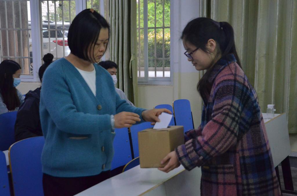 崔依琳宣读了《中共信阳师范学院awc777万象城娱乐官网各支部委员会选举办法》(草案),大会表决通过了选举办法(草案)和监票人、计票人名单;王怡同志宣读了新一届党支部委员会委员候选人简介。之后,按照组织程序和选举办法,支部全体党员以无记名投票方式,选举产生了由杨辉、李东东、林飞、崔钰争四名同志组成的新一届支部委员会。大会在雄壮的《国际歌》歌声中圆满落下帷幕。