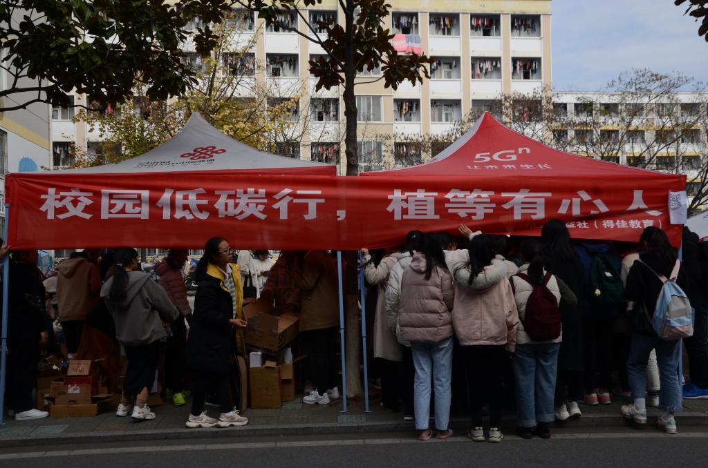 活动尚未开始,已有大批参与者排队等待,路过的同学也被该活动吸引,纷纷驻足,加入长队等待领取一抹绿色。活动过程中,工作人员将准备好的盆栽按类别摆好,并为同学们详细介绍活动流程和注意事项。同学们积极响应低碳环保理念,拿着收集已久的纸箱、塑料瓶进行换购,可爱的多肉植物和小礼品也激起了在场同学们的兴趣,大家纷纷细心挑选,拍照留恋。此次活动主要是通过以物换花、以旧换绿的方式让同学们了解到废旧物品的价值,增强学生收集可再生垃圾的意识,做到低碳环保,追求时尚新生活。