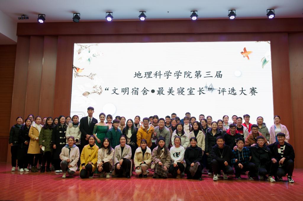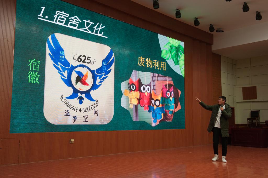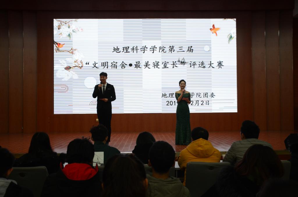 本次活动分为文明宿舍评选与最美寝室长评选两个环节。比赛在主持人对评选流程的讲解中拉开序幕。各个寝室代表依次运用PPT,从宿舍文化、宿舍生活和寝室长的引领作用三个方面展开详细介绍。11号公寓611寝室从富有专业特色的地球形宿徽讲起,简明扼要的寝室文明公约与精美的宿舍布置给台下观众留下了深刻印象;11号公寓615寝室长卢秋月幽默自然地为观众们介绍了“四喜丸子”的宿舍生活,别具一格的宿舍风格、简洁大方的宿舍徽章、环保的生活理念赢得了场下观众的热烈掌声。本次活动也穿插精彩的歌曲和小品表演,歌手深情对唱的《十年》与晨曦话剧社带来的《一代宗师》在选手竞演期间给全场观众带来了欢喜。最后,11号公寓611寝室获得一等奖,11号公寓615寝室与22楼609寝室分别获得二等奖,22号公寓613寝室等三个宿舍获得三等奖,卢秋月、杨璐莹、杜帅良、邢一帆、罗思雨荣获“最美寝室长”称号。曹鹏鹏给获奖成员颁发证书并进行总结性讲话,他表示本次活动对寝室内部的和谐起到了推动作用,并向同学们寄予了相互包容、求同存异的期望。