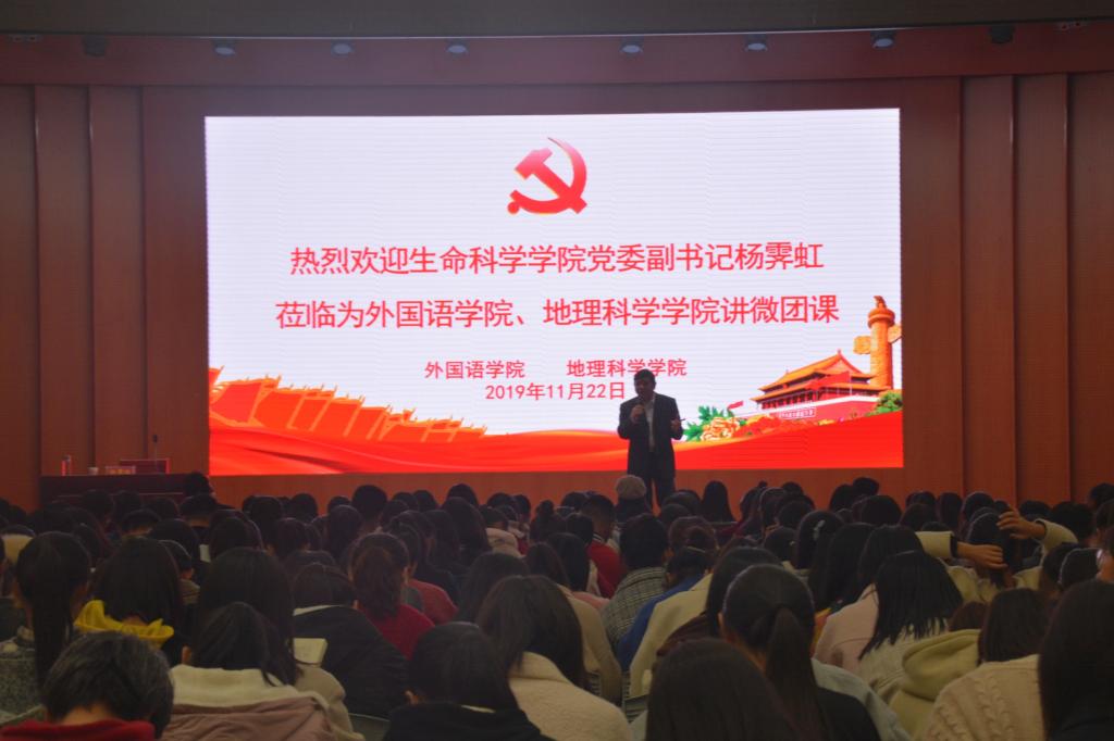 11月22日,生命科学学院党委副书记杨霁虹应邀于逸夫楼报告厅为万象城官网及外国语学院2019级学生讲授团课。万象城官网团委老师曹鹏鹏,外国语学院团委书记孔宪巍及两个学院2019级全体学生共同参与此次活动。