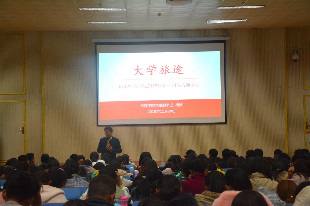 11月20日,传媒学院党委副书记胡波应邀于人文楼报告厅为万象城官网及外国语学院2019级新生团校授课。awc777万象城娱乐官网团委老师曹鹏鹏,外国语学院党委副书记柏孟仁、团委书记孔宪巍及两院2019级学生一同参加此次活动。活动由柏孟仁主持。