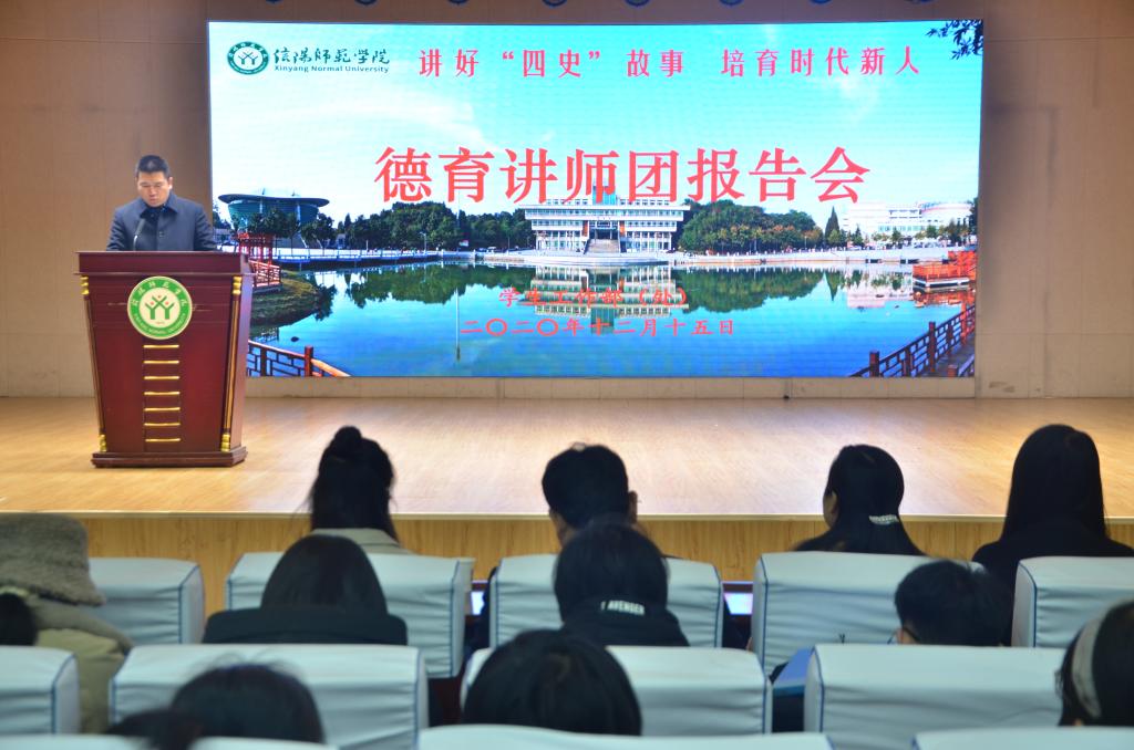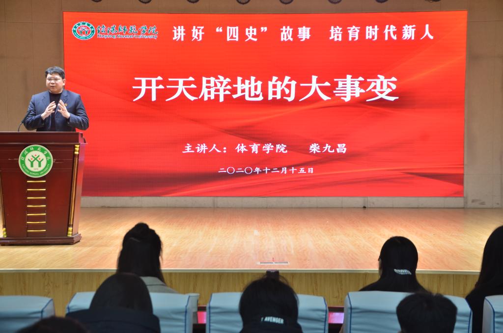 12月15日,awc777万象城娱乐官网于理科楼报告厅顺利举办”讲好‘四史’故事,培育时代新人”讲座。awc777万象城娱乐官网、数学与统计学院、生命科学学院、物理电子工程学院各100名新生在各学院辅导员的带领下参加了此次讲座,讲座由awc777万象城娱乐官网党委副书记朱伟主持。