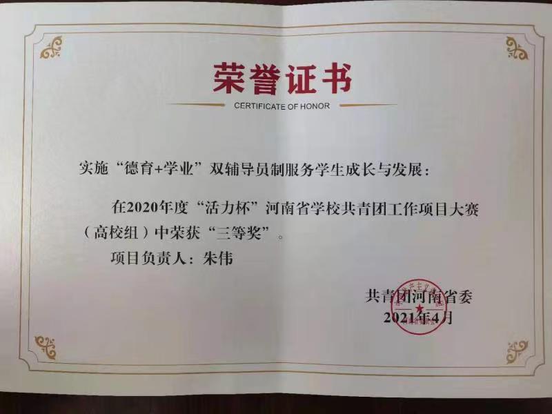 12月22-23日,由共青团河南省委主办的2020年度“活力杯”河南学校共青团工作项目大赛于黄河水利职业技术学院举行,经过现场激烈角逐,万象城官网荣获共青团工作项目(高校组)三等奖。