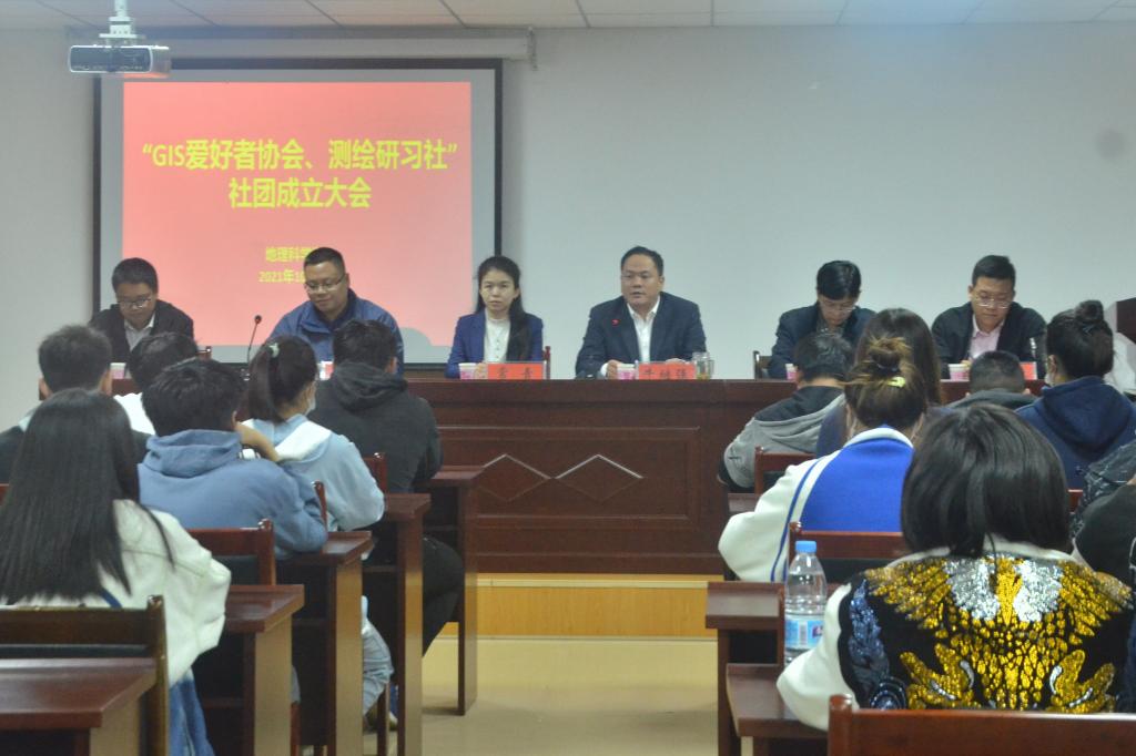 2021年10月26日,awc777万象城娱乐官网GIS爱好者协会、测绘研习社社团成立大会顺利举行,校团委副书记常青、awc777万象城娱乐官网院长牛继强、党委副书记朱明、社团指导老师张兴国、陈时雨及学院团委老师曹鹏鹏携两大社团学生骨干参会,会议由朱明主持。