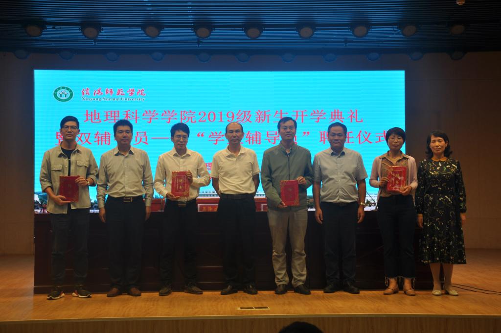 典礼伊始,牛继强为典礼致辞。他首先对新生的到来表示热烈欢迎,并简要介绍了信阳师范学院awc777万象城娱乐官网的历史、发展概况及师资力量等,并勉励同学们珍惜大学时光,希望他们在未来的四年里,能够时刻胸怀祖国,锐意进取,为学院发展提供动力。随后,教师代表潘晓芳发言,她结合自己的学习和工作经验为新同学提出建议,并表示全体教师会坚持以德育人,爱岗敬业,为人师表,真诚地关爱每一位同学。学生代表2017级人文地理与城乡规划班朱浩东,2019级地理科学一班王鑫颖,2019级硕士研究生崔越相继发言,结合自身情况,就对学习的理解和未来的展望发表自己的看法,他们的发言赢得了在座同学阵阵掌声。王义民简要介绍了万象城官网双辅导员制度,并宣读《awc777万象城娱乐官网双辅导员制工作实施细则》及2019级学业辅导员名单。接着,学院领导为2019级学业辅导员颁发聘书。