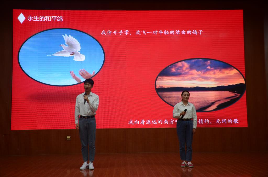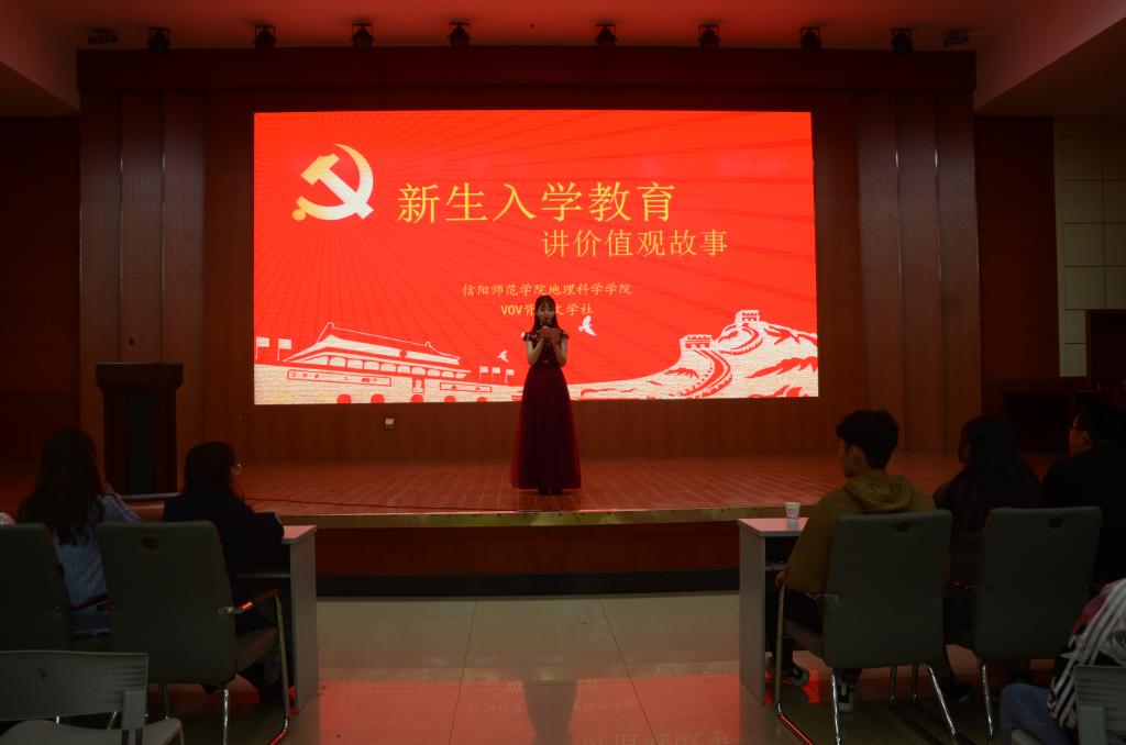 活动伊始,播放信阳师范学院社会主义核心价值观主题教育成果展视频,介绍学校《讲价值观故事实现青春梦想》主题教育 ,让大学生了解社会主义核心价值观主题教育开展的情况。宣读了《awc777万象城娱乐官网关于举行"讲价值观故事,实现青春梦想"社会主义核心价值观主题教育的活动方案》。方案指出,开展新生入学价值观教育活动是落实立德树人根本任务的重要内容,awc777万象城娱乐官网将深入开展相关活动。随后,曹鹏鹏老师就新生入学教育方面作出讲话,他对新生的加入表示欢迎,同时指出对大学生进行价值观教育的重要性。强调学生在大学期间要培养自主学习意识,要增强适应能力,要全面发展。最后,寄语大一新生能够承担责任,牢记使命,不忘初心,不悔四年光阴,为了美好明天而奋斗。随后,张云露等学生代表围绕社会主义核心价值观为在场师生带来《厚德崇实,善学敏行》、《永生的和平鸽》、《一个家,三代人,富强梦》、《让星星把我们照亮》等打动人心的作品。
