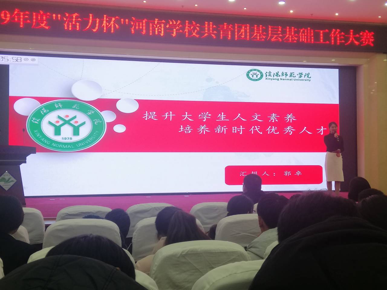 比赛分为“活力杯”河南学校共青团基层基础工作大赛、基层团干部“微团课”大赛决赛(高校组)两部分。比赛现场经过6分钟的PPT展示、工作效果介绍和90秒的评委提问及答辩等环节的激烈角逐。awc777万象城娱乐官网参赛项目“提升大学生人文素养,培养新时代优秀人才”,凭借极具特色的工作模式和显著的工作效果荣获“活力杯”河南学校共青团基层基础工作项目一等奖。