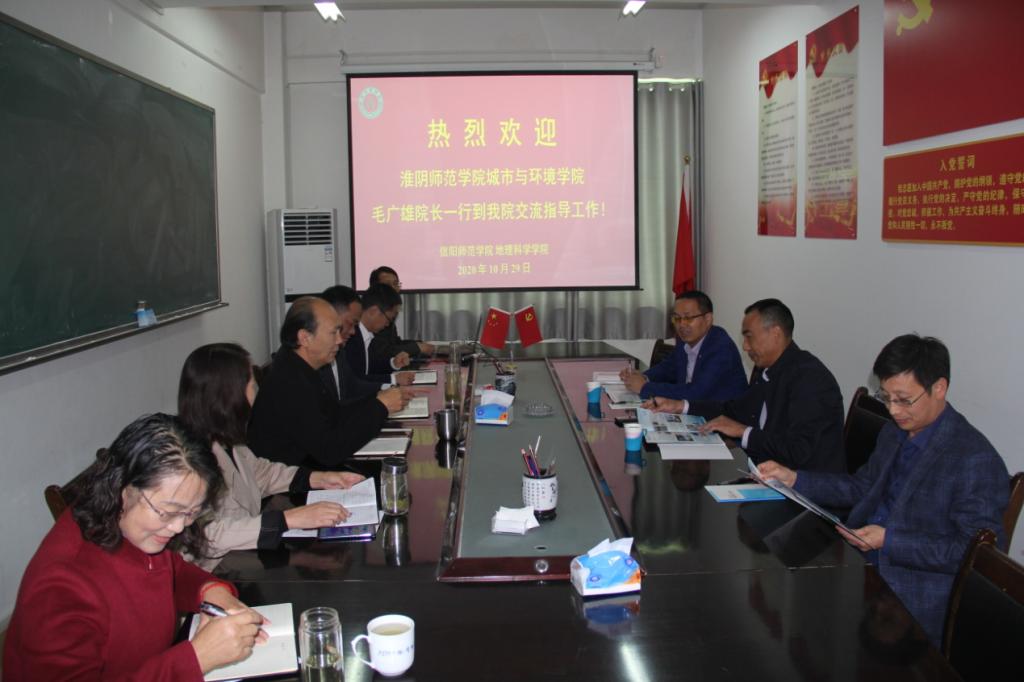 10月29日下午,淮阴师范学院城市与环境学院院长毛广雄、副院长刘传明、院办主任王从盛一行来万象城官网考察交流,座谈会在理科楼南楼403会议室举行。awc777万象城娱乐官网党委书记吴泽成、副院长牛继强、王义民、刘明华、高军波及有关人员参加座谈会。会议由牛继强主持。