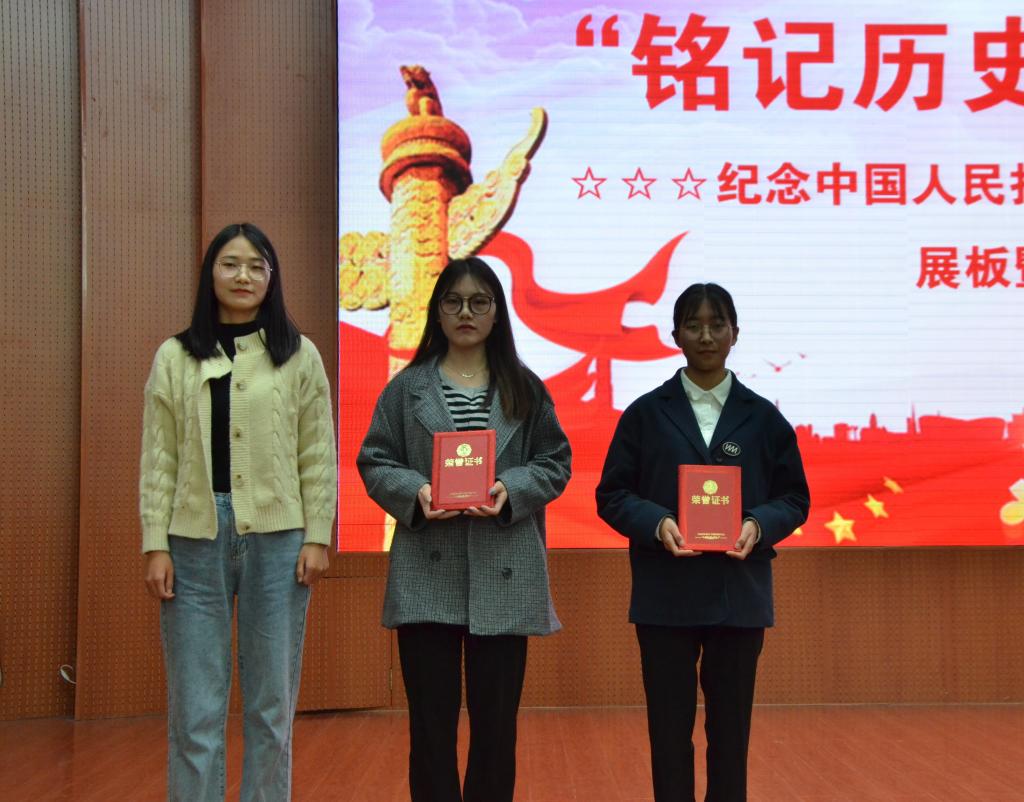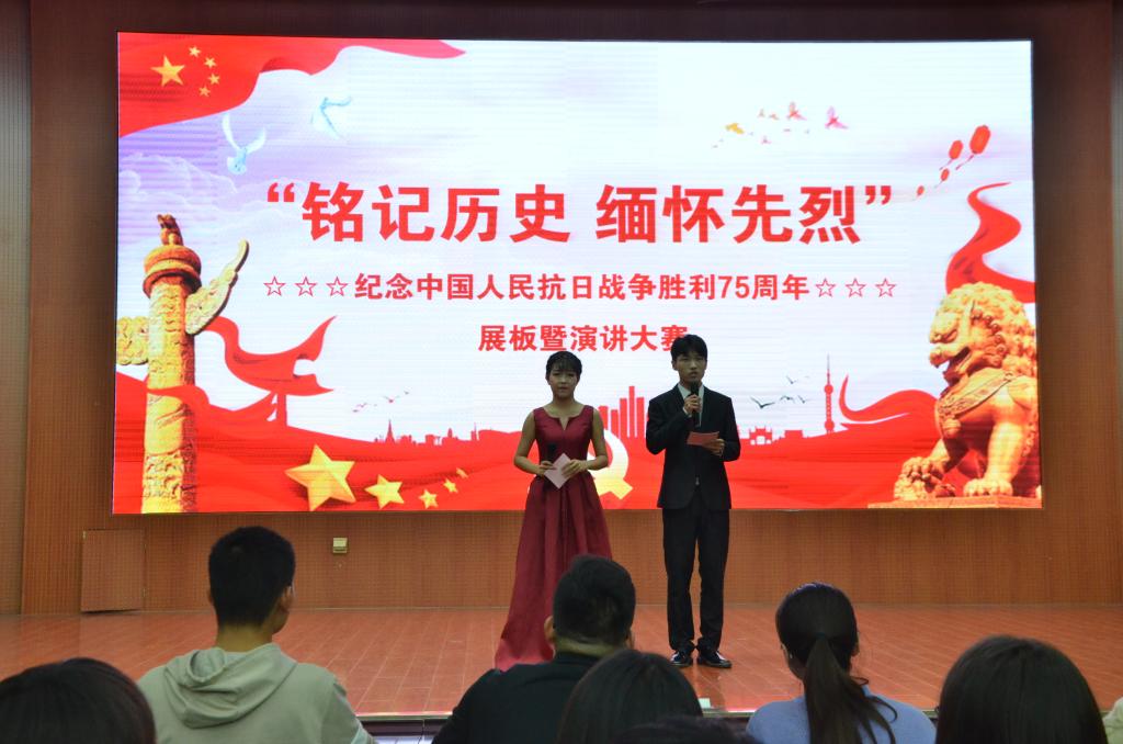 11月14日,由信阳师范学院学生会和awc777万象城娱乐官网团委学生会联合主办的“铭记历史 缅怀先烈”暨抗日战争胜利75周年展板及演讲大赛于逸夫楼成功举办。awc777万象城娱乐官网团委老师曹鹏鹏、各院系的学生会主席和负责人一同出席了此次活动并担任评委。