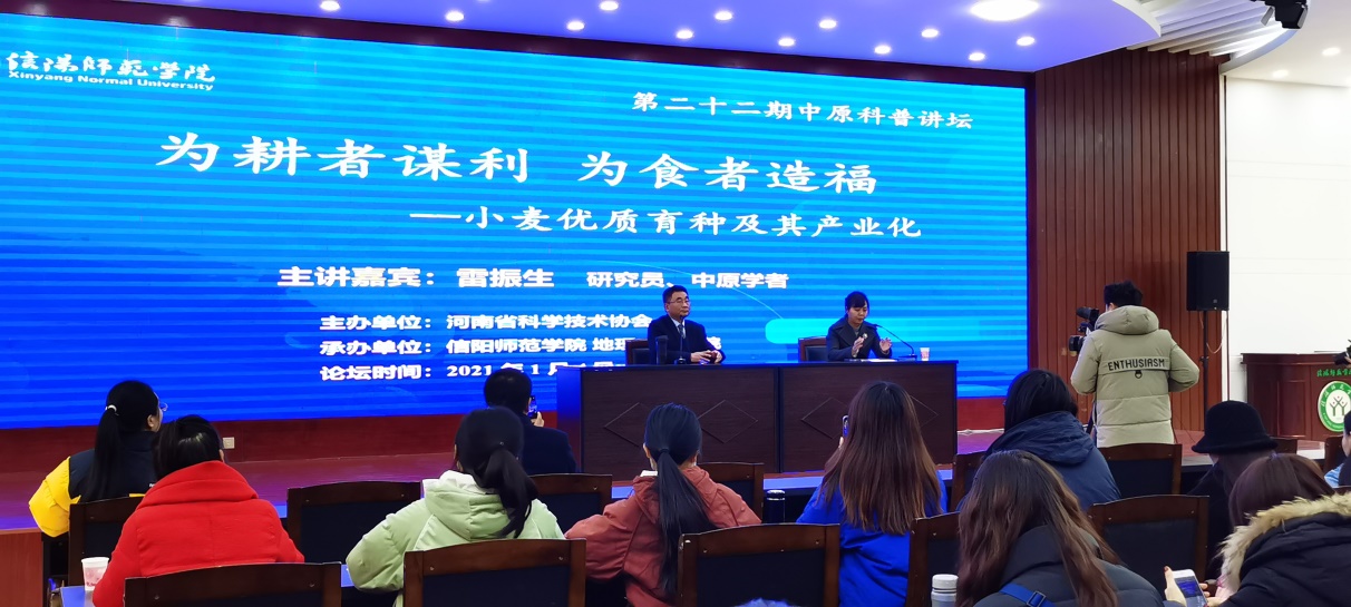 1月4日,由河南省科学技术协会主办、信阳师范学院承办的第二十二期中原科普讲坛在信阳师范学院开讲。河南省农业科学院小麦研究所所长雷振生研究员做了题为“为耕者谋利,为食者造福——小麦优质育种及其产业化”的科普报告。央广网、河南广播电视台、河南日报等媒体进行现场直播。信阳师范学院青年教师、研究生、本科生及网络观众共计6万人聆听讲座,报告由信阳师范学院副校长郑云教授主持。